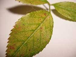 - Κατά την προσβολή του τετράνυχου, στην επάνω επιφάνεια των φύλλων των φυτών παρουσιάζεται ένα χαρακτηριστικό κιτρίνισμα.